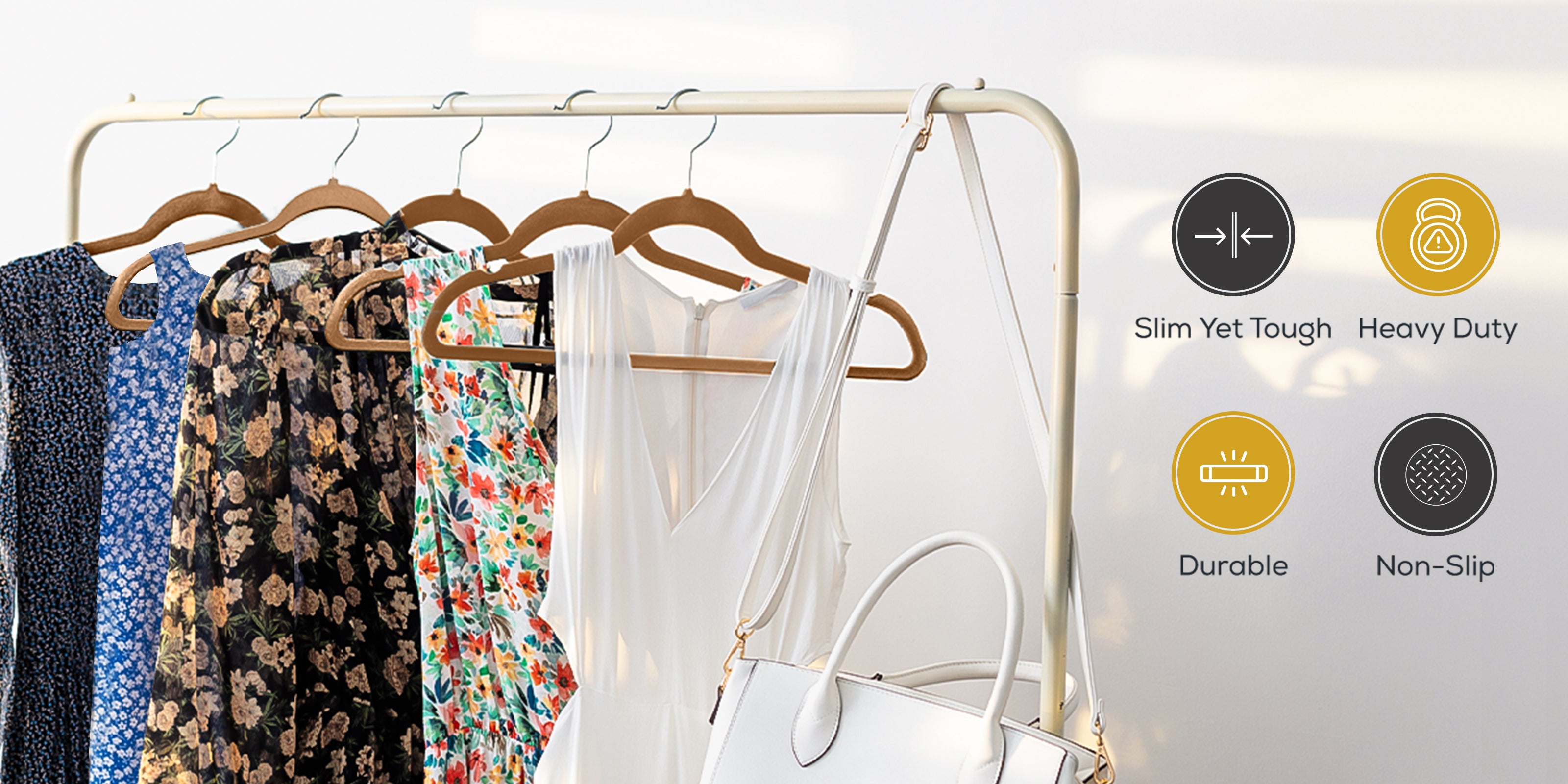 Beyond their sleek design and durability, our hangers save space, prevent wardrobe mishaps with non-slip velvet, and cater to all clothing types. Plus, their lightweight build and rotating hooks make organizing a breeze.